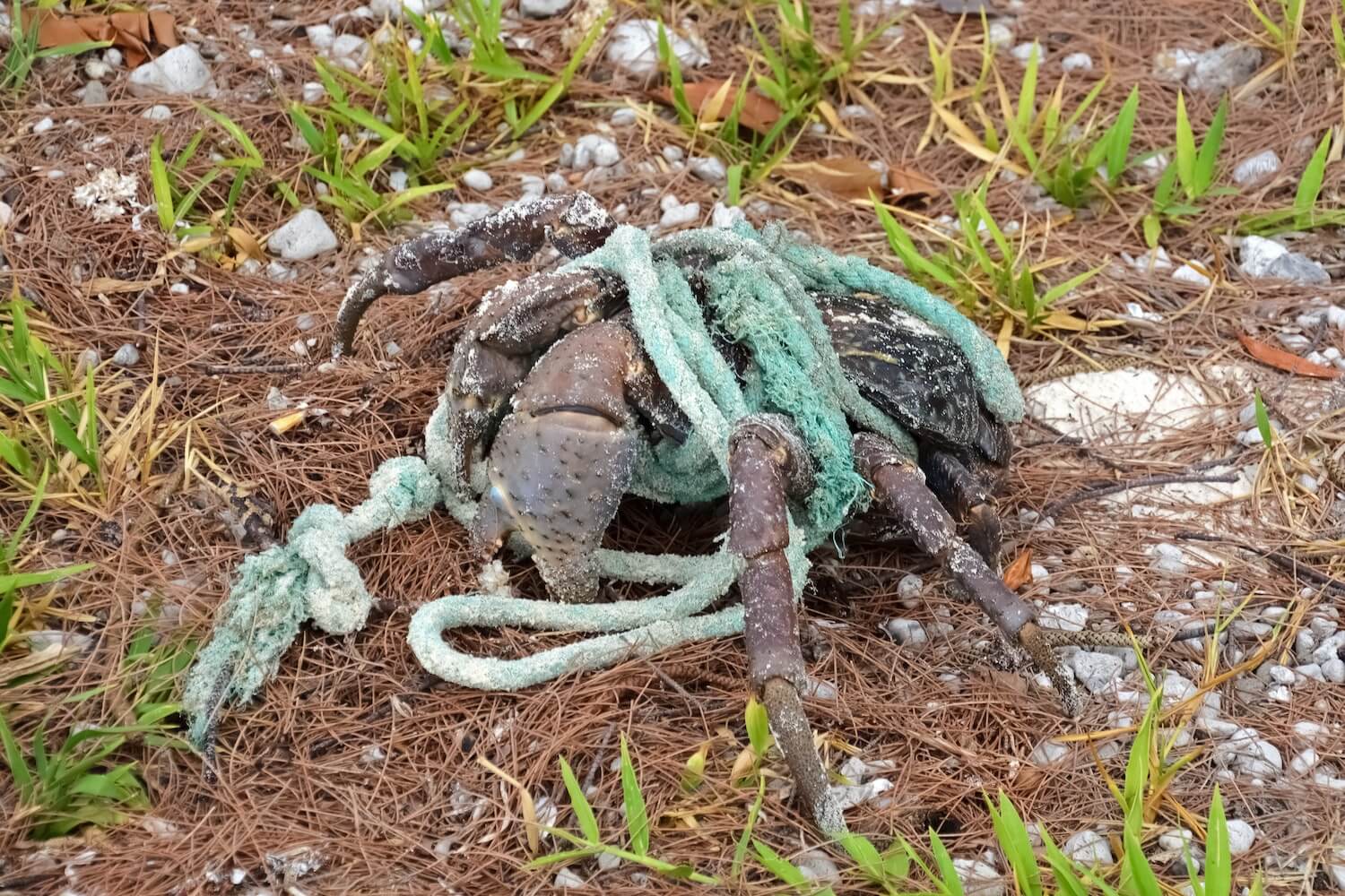 A coconut crab tangled in fishing rope—the fishing industry both directly and indirectly impacts coconut crab populations. | Jeremy Bezanger / Unsplash]