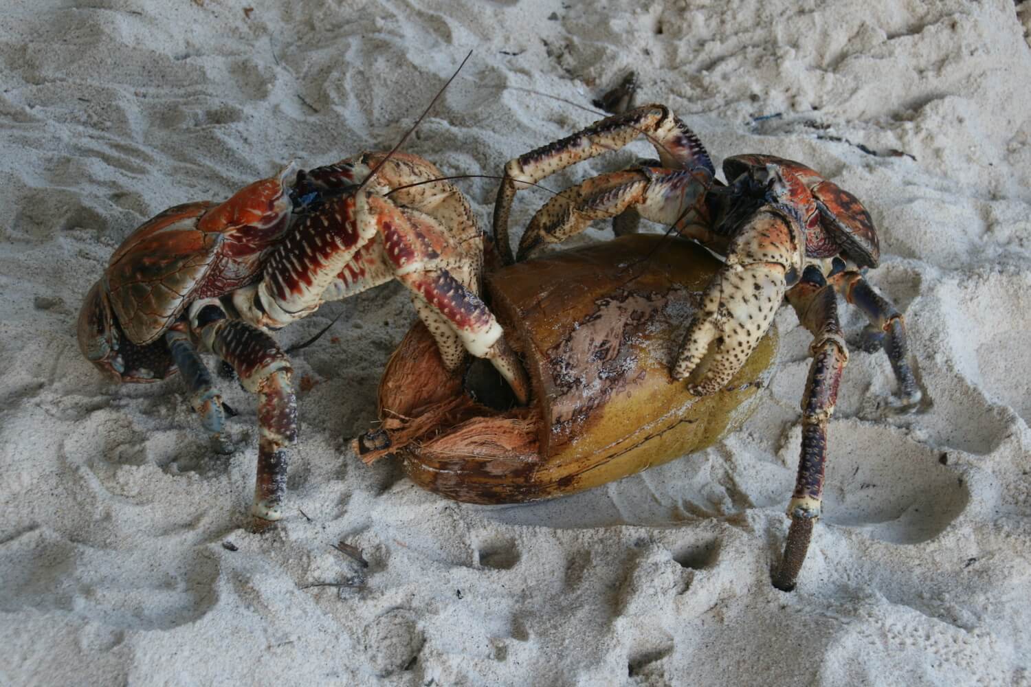 islands in relatively low numbers. The crabs can reach over a metre in diameter and have powerful claws that they use to crack open coconuts—the main component of their diet.