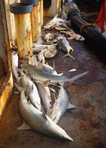fish sharks for their meat and oil. In addition to those fished for their meat, many are caught for their fins and thrown back into the ocean — a practice known as finning.
