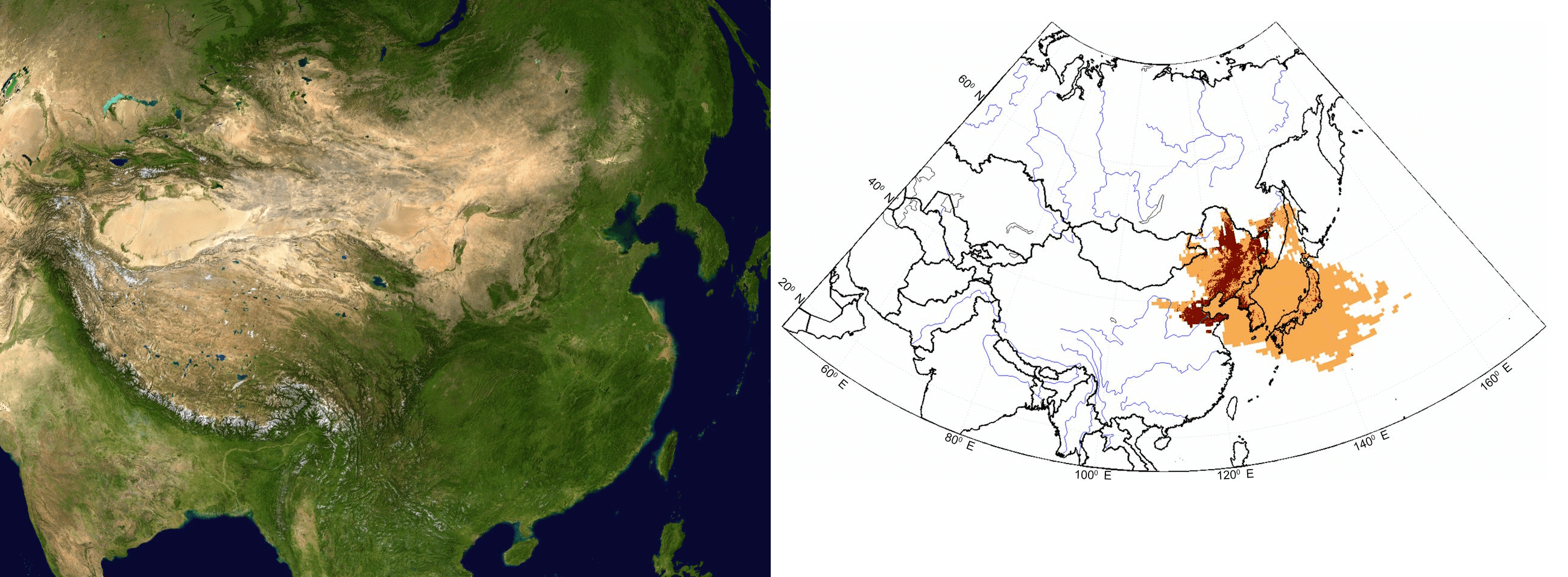 A satellite image of China (left) and particle model (right) shows the location of particles (in yellow) for the dates within the three epidemics and brown dots represent crops according to NASA land images. | NASA WorldWind via