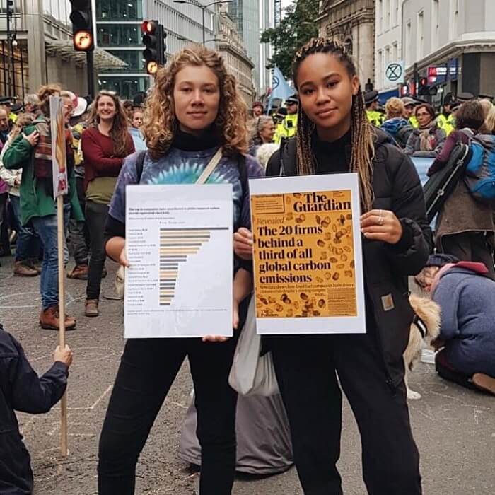 Josephine Becker (left) and Mikaela Loach (right) protesting outside the Government Oil and Gas Fiscal Summit by Liverpool Street Station, London, to address the fossil fuel companies exploiting the earth. | The Guardian / Instagram