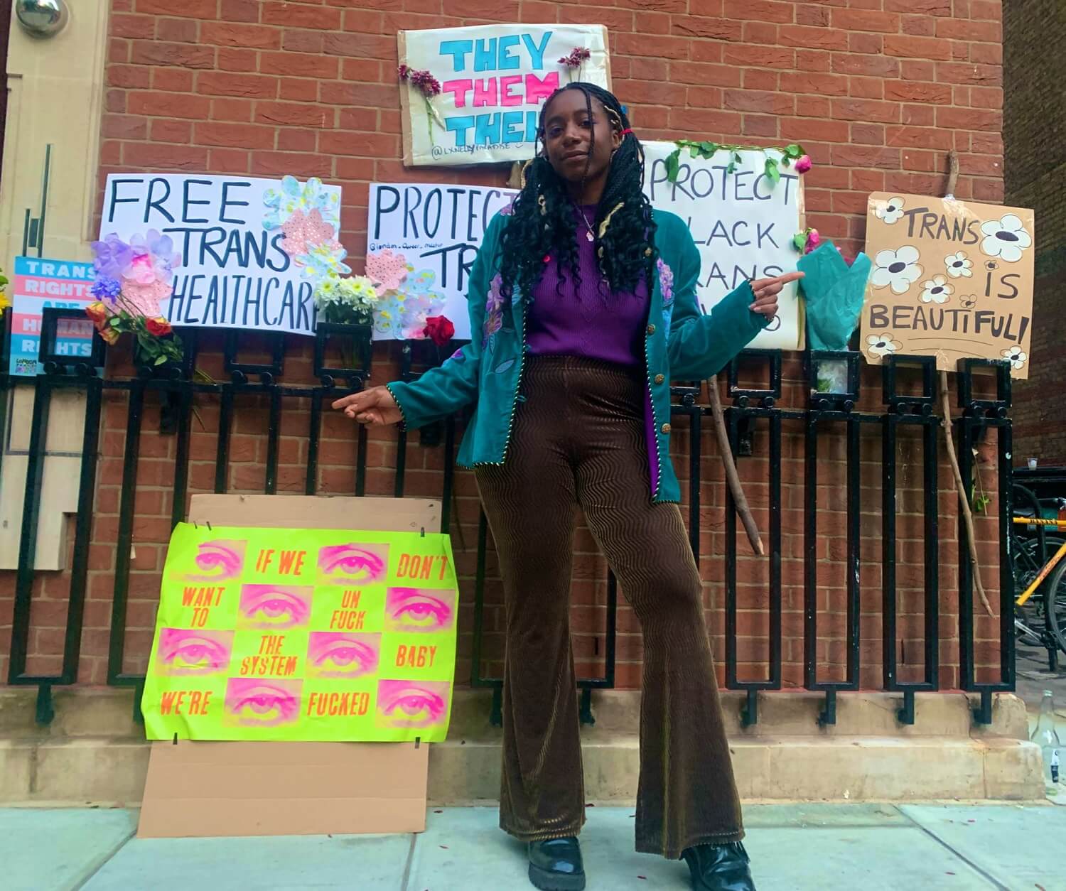 Dominique protesting for trans rights. She also has been protesting online and offline against the Cambo field development. | Twitter / Dominique Palmer